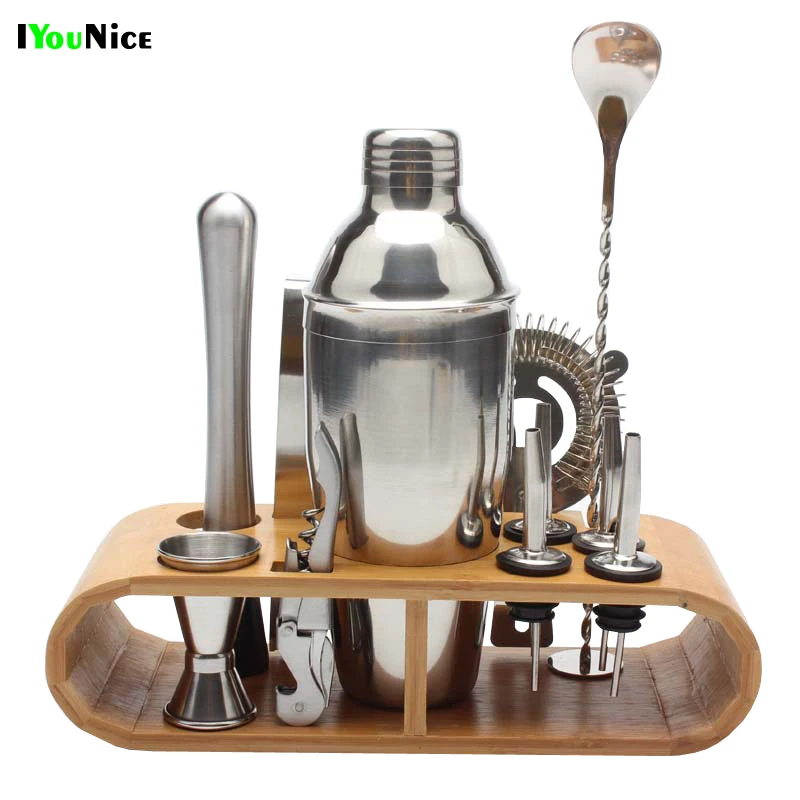 Купить дешевый Iyoulnice 9 шт. 550 мл шейкер набор Джиггер смешивания ложка Тонг барная посуда бармен инструменты w дерево хранения стенд баров Смешанные Напитки Цена