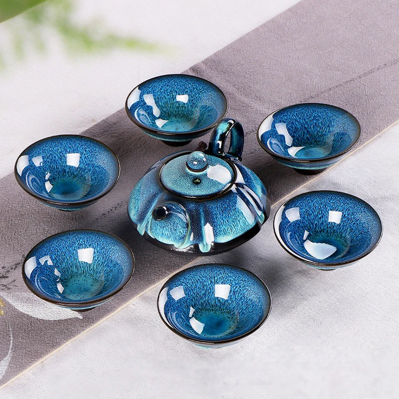 1 Pot 6 чашек синий желтый глазурью фарфор Офис аксессуары Gaiwan онлайн